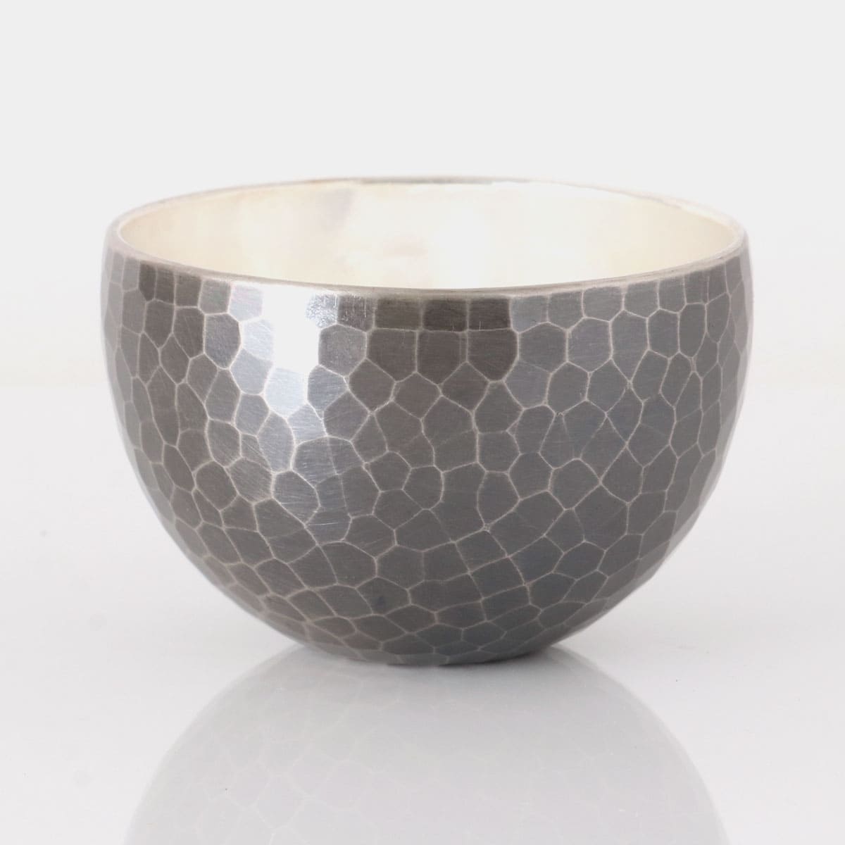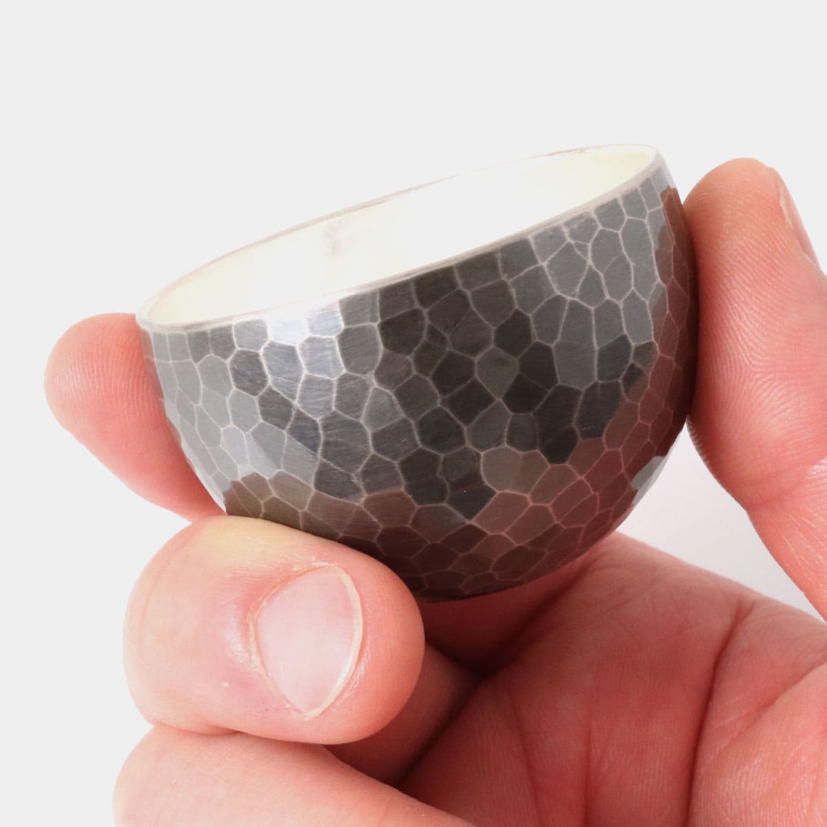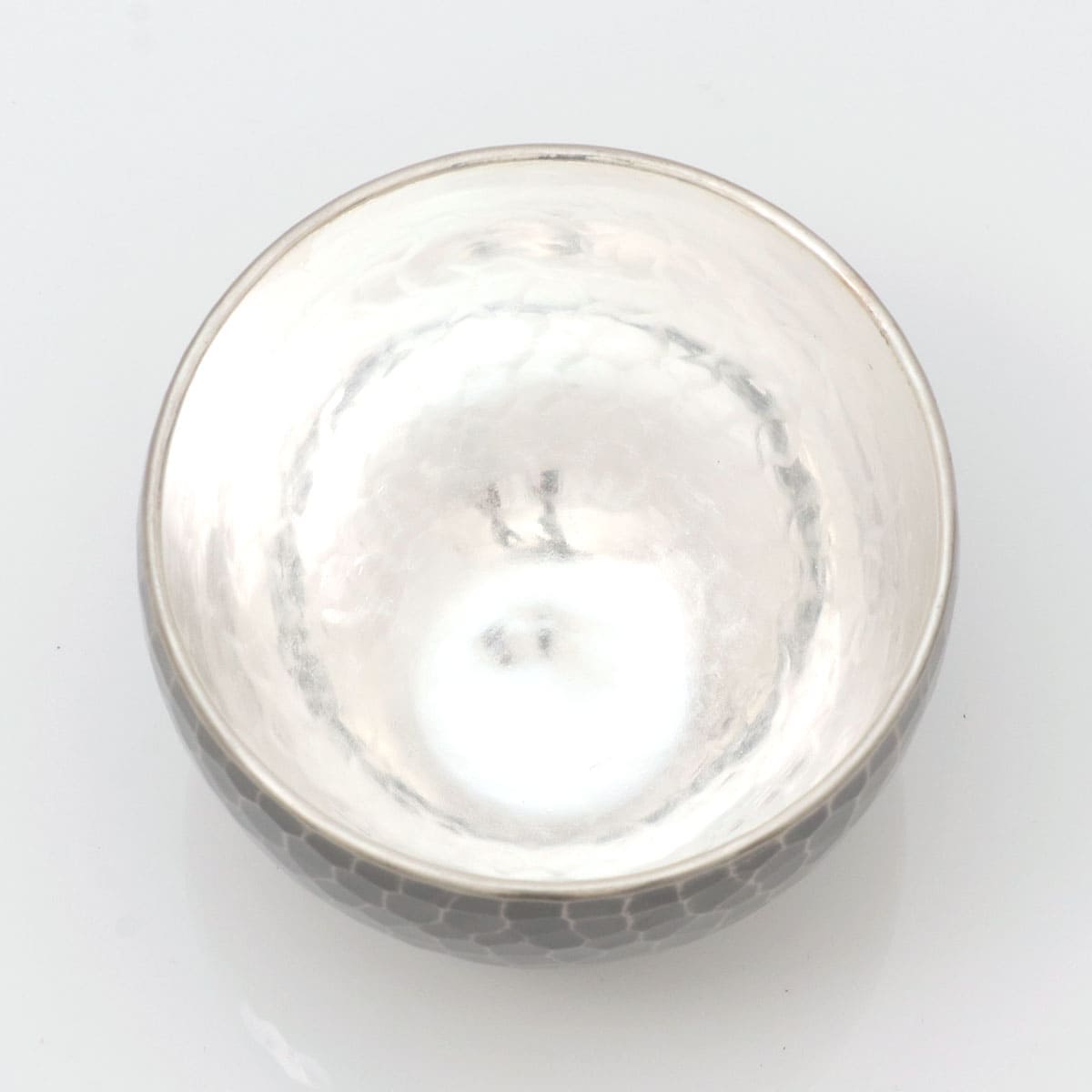 銀メッキを施されたシックな黒が映えるぐい呑みです。黒光りする銀に斑模様が格好良く、重厚感と落ち着いた雰囲気から大人の男性へのプレゼントに人気です。季節の花や葉などで料理を飾りつけたり、四季に合った調度品や器が映える和食では、さりげない存在感でありながら邪魔をしない丁度よい美しさを持っています。金メッキのぐい呑みとセットにし、金銀の杯として贈られる方も多い逸品です。