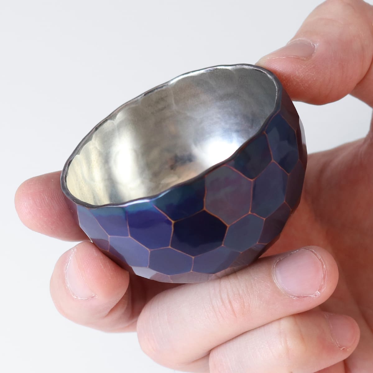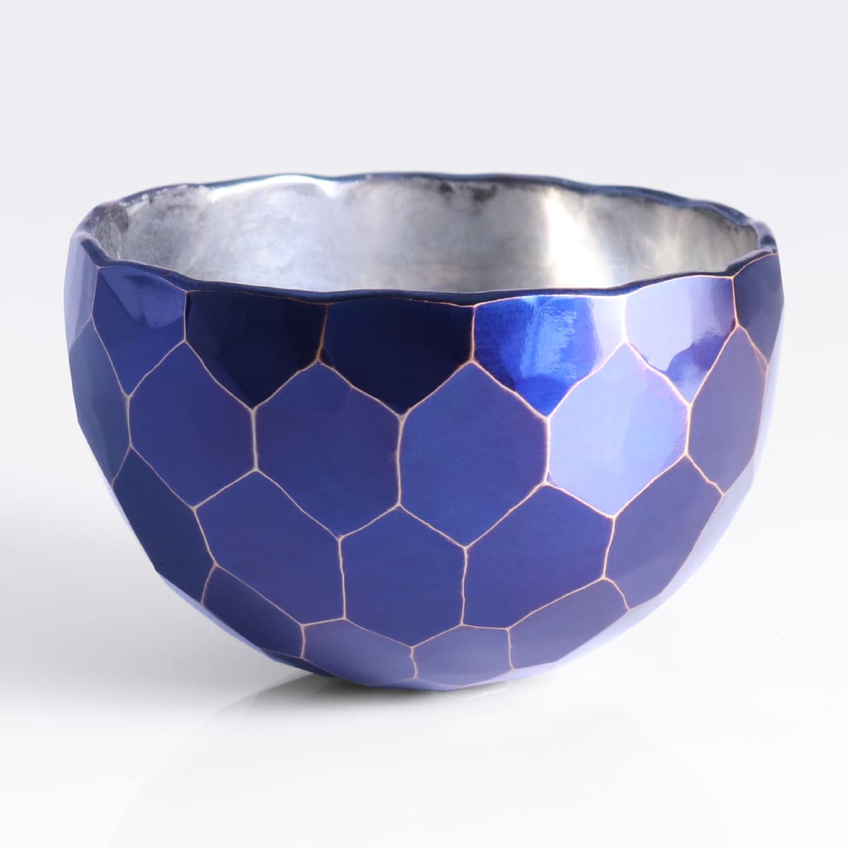 [清雅堂]鎚起銅器|酒器|亀甲紋「ぐい呑み」青藍色(口径60mm、容量64ml)