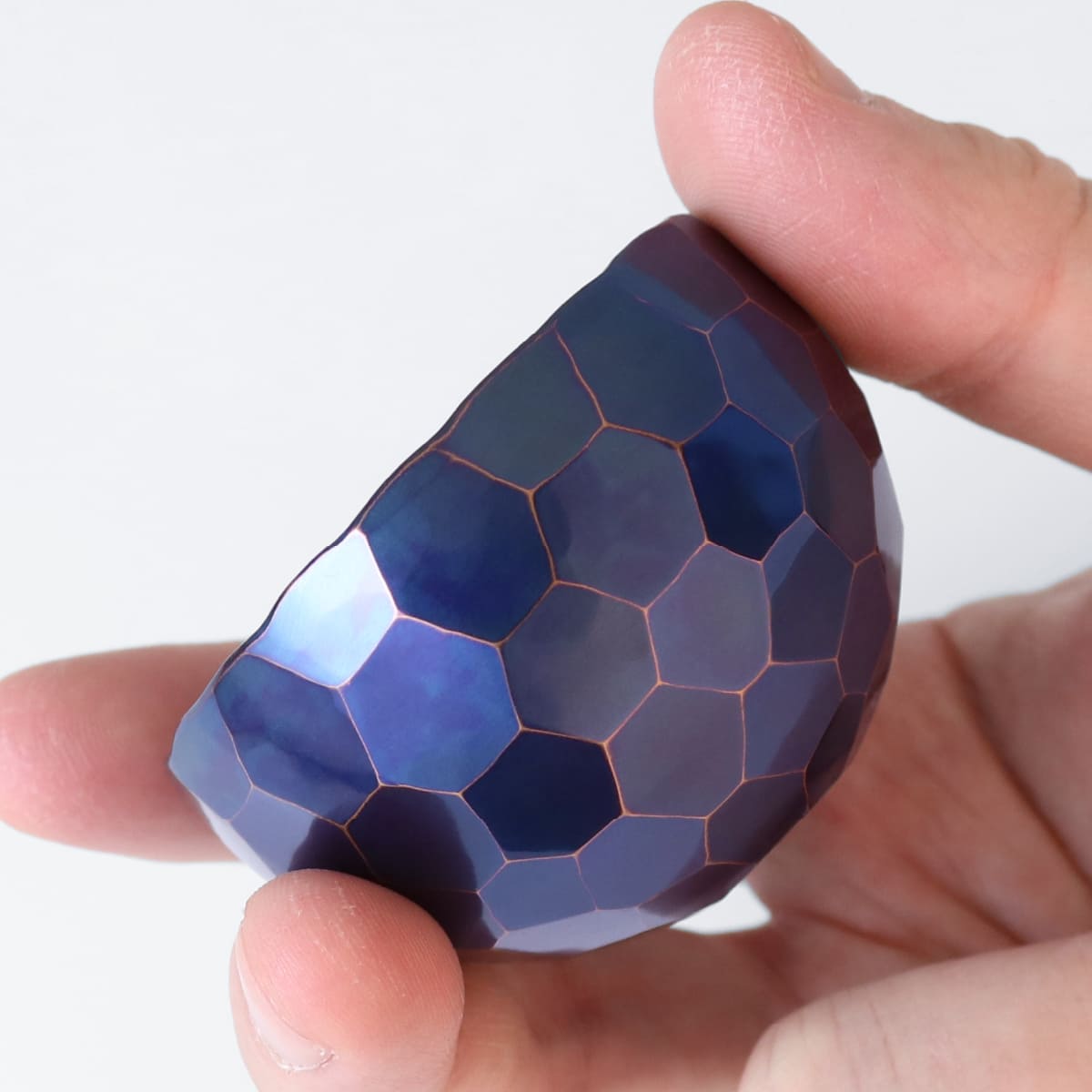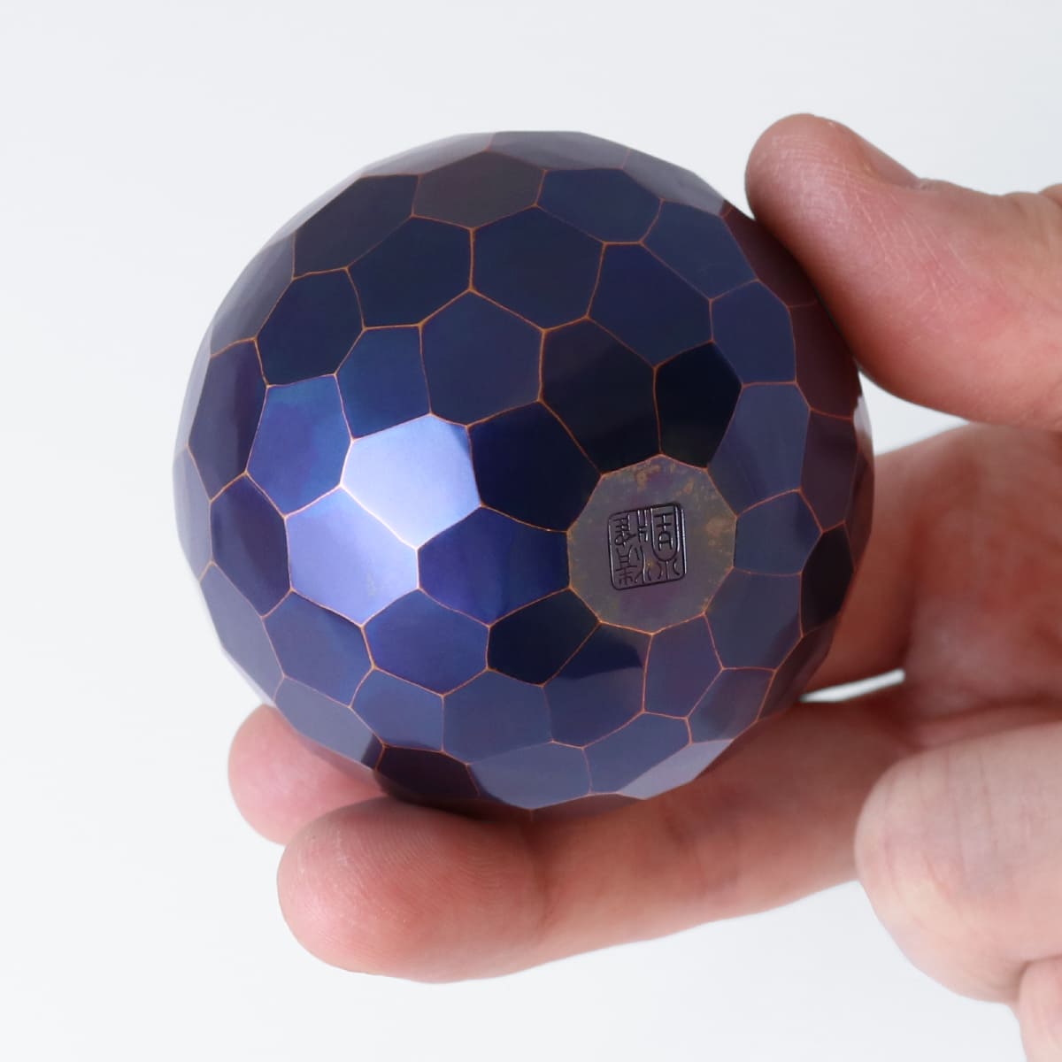 硫黄水溶液で銅の地を黒くした後に研磨し、煮色液でさっと煮た色。紫金色より鮮やかな色ですが、発色皮膜がデリケートなため植物蝋よりも丈夫なラッカーコーティングで仕上げています。